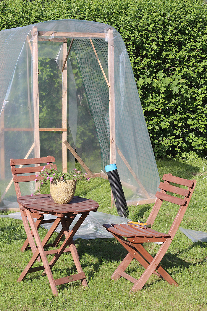 "Onks tää vähä ratula", kysyi 17-vuotias helsinkiläisserkku, joka viikko-pari takaperin auttoi kasvihuoneen kasaamisessa. No, onhan se varmaan. Piti vielä kuitenkin varmistaa, että oliko R-sanaa käytetty halveeraavassa vai neutraalissa merkityksessä. Ei tämä viime kesänä ensimmäistä kertaa käyttöön otettu TSI-muovihuone mikään varsinainen kaunistus ole, mutta itsekyhäämäksi yllättävän kestävä, kun jo kerran toista kesää tällä tomaatteja lämpimänä pidetään. Mitään yllänähtyä tekstiä nokkelampaa en julkisivua koristamaan keksinyt. Seisköön nyt siinä, kaikessa itsestäänselvyydessään. Sitä kaunista, vanhoista ikkunoista koottua huvimajamaista lasihuonetta odotellessa.